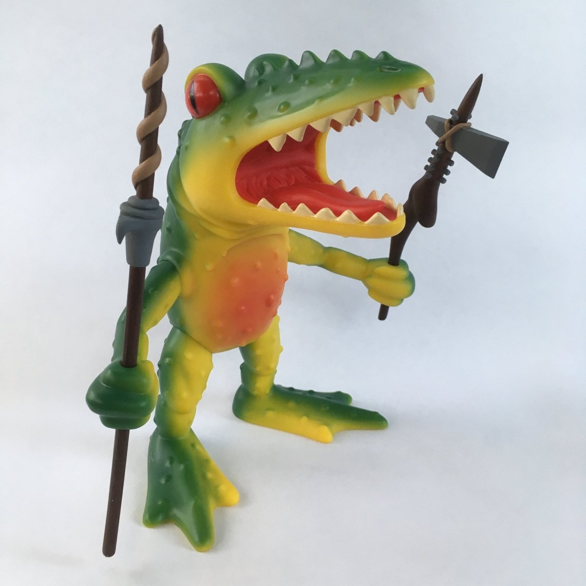 The Froggacuda vinyl toy is approximately 9 inches tall, with 6 points of articulation at the shoulders, wrists, and hips.