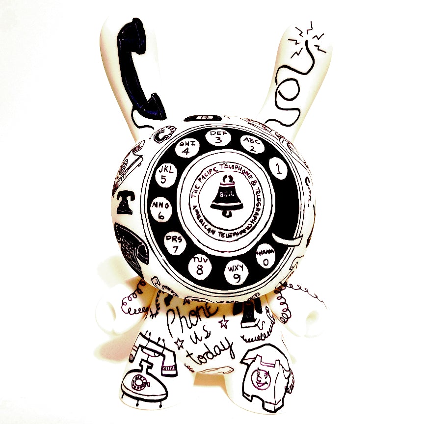 One of a kind hand painted vinyl toy, originally produced by Kidrobot. Covered in hand painted clip art style imagery of telephones - antique phones, phone parts and inages containing phones.