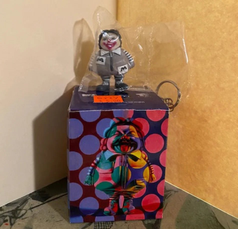 This item comes from the personal collection of one of our oldest customers. He is clearing out his impressive collection to focus on fewer pieces. This item is in excellent but secondhand condition. It has been opened once to visually inspect it after it was purchased, but it has never been displayed out of the box since then. Original packaging included. Ron English blind box keychain opened to determine colorway which is grey and white. Figure is mint, box is indented on one side.