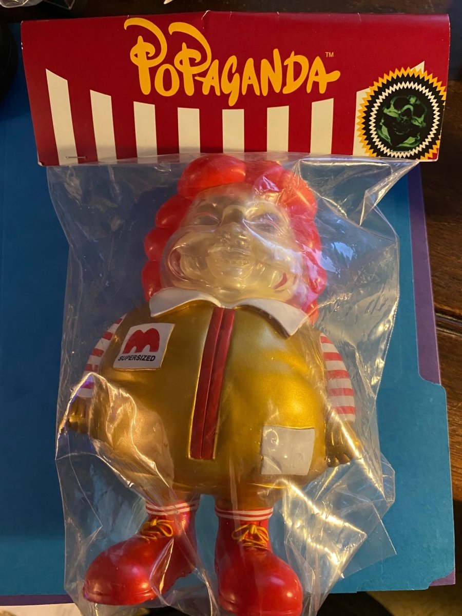 McSupersize 7-inch original design gold colorway with glow in the dark X Ray skeletal face, red hair, and red shoes, glows green. Header card has six minor color breaks on the top edge of the card. These items are sold in as-is condition. They are all good second hand condition and suitable for display and appreciation, but they are NOT mint. Each item is over a decade old and may bear small marks and blemishes in the paint or finish that are not immediately evident in the photos we've provided. This item comes from the personal collection of one of our oldest customers. They are clearing out an impressive collection to focus on fewer pieces. This item is in excellent but secondhand condition. It has been opened once to visually inspect it after it was purchased, but it has never been displayed out of the box since then. Original packaging included.